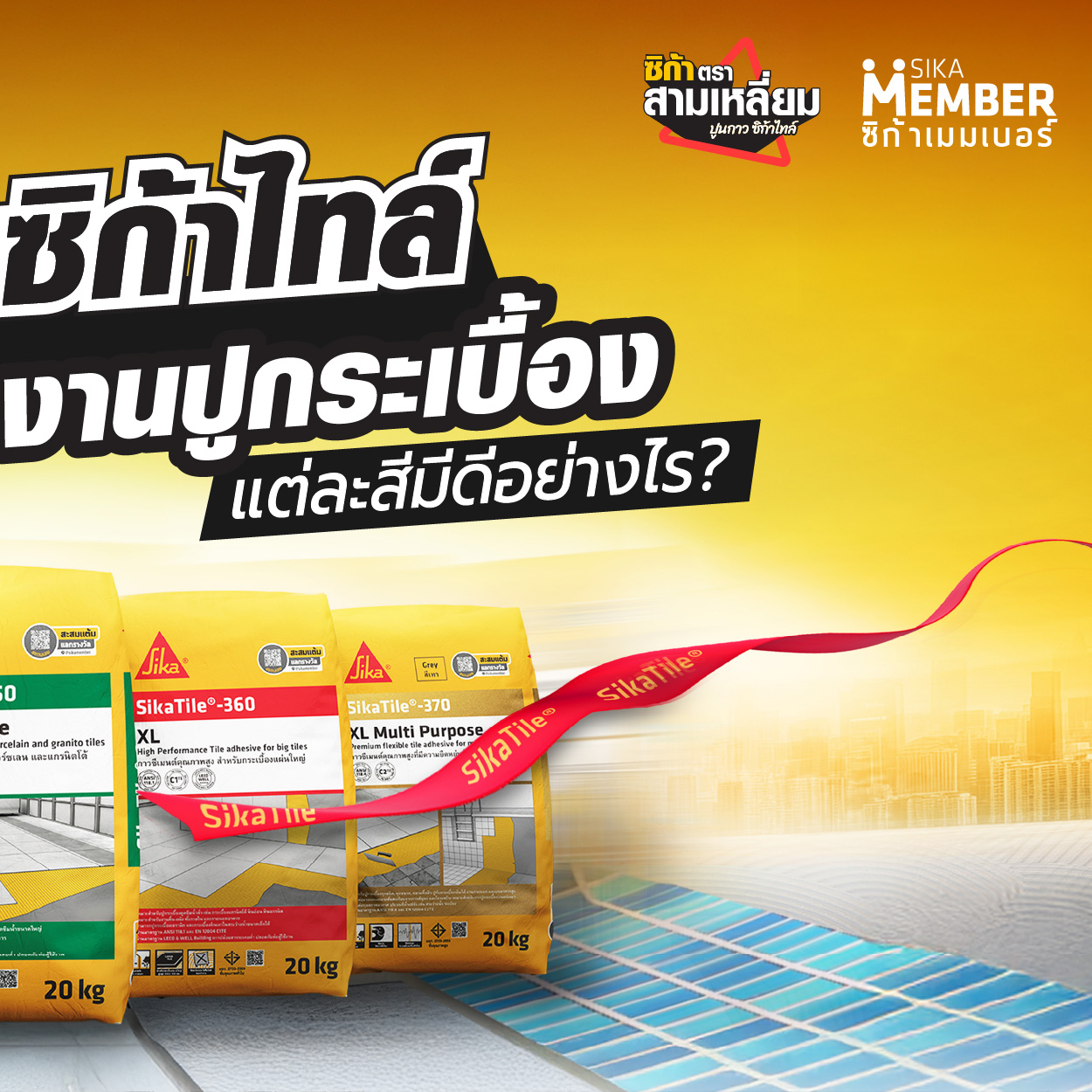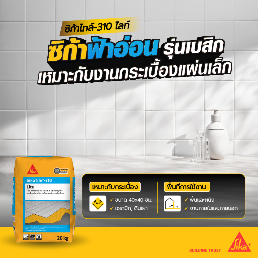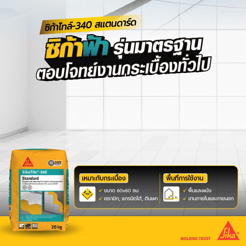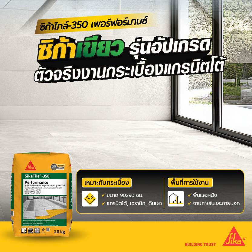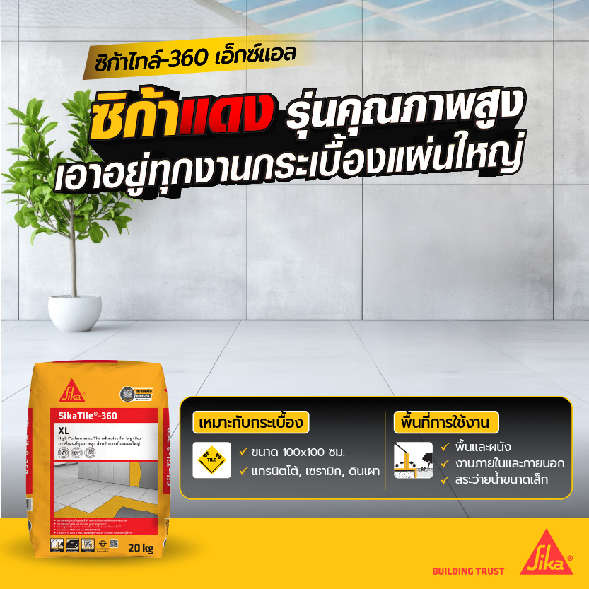 SikaTile-360 XL กาวซีเมนต์ผสมโพลิเมอร์ เหมาะสำหรับกระเบื้องแผ่นใหญ่ขนาดสูงสุด 100×100 ซม. และกระเบื้องดูดซึมน้ำต่ำ เช่น แกรนิตโต้ หินแกรนิต หินอ่อน หินธรรมชาติปูกรณีกระเบื้องบนผนัง ขนาดใหญ่กว่า 60 x 60 ซม.ใช้ได้ทั้งพื้นและผนัง ภายนอกและภายใน มีมอก. 2703-2566