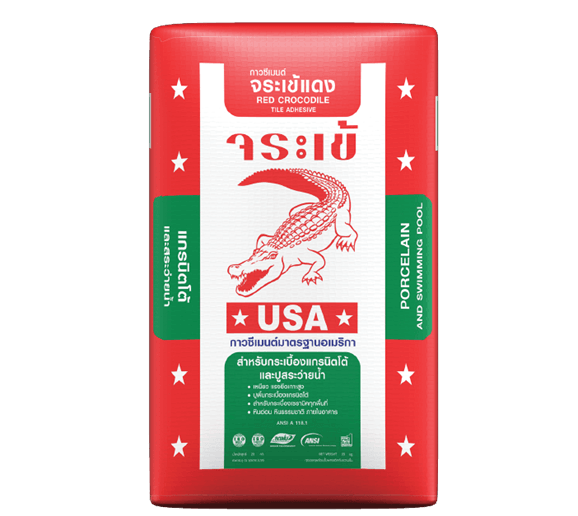กาวซีเมนต์ จระเข้แดง เหมาะสำหรับงานปูกระเบื้องขนาดใหญ่ กระเบื้องทั่วไป กระเบื้องดูดซึมน้ำต่ำ พื้นหินอ่อน และ แกรนิต ความหนาของกาวซีเมนต์ควรจะอยู่ระหว่าง 4-5 ม.ม.