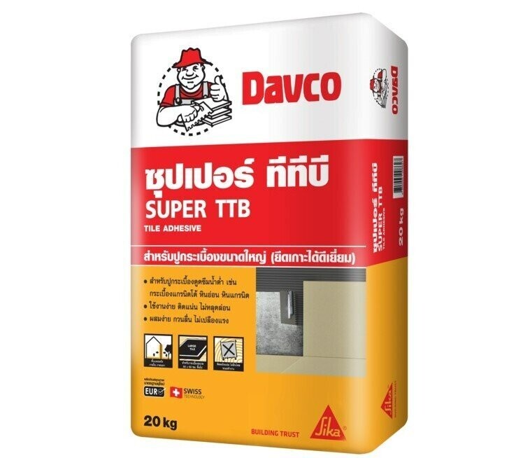 Davco (เดพโก้) ซุปเปอร์ ทีทีบี เป็นกาวซีเมนต์คุณภาพสูง เพิ่มสารโพลิเมอร์เพื่อเสริมการยึดเกาะให้ดีเยี่ยม และลดปัญหากระเบื้องหลุดล่อนในการปูกระเบื้องขนาดใหญ่ หรือดูดซึมน้ำต่ำ บนพื้นผิวแข็ง สามารถปูหนาเพื่อปรับระดับโดยเฉพาะหินธรรมชาติที่ผิวไม่เรียบ เช่น หินกาบ หินชนวน และสามารถปูบนพื้นผิวทากันซึม และในบริเวณที่สัมผัสน้ำอย่างเช่น ห้องน้ำ ห้องครัว แห้งเร็วจึงสะดวกในการทำงานต่อเนื่องไม่จำเป็นต้องแช่กระเบื้องในน้ำก่อนปู ใช้ปูได้ทั้งแบบหนาและแบบบาง