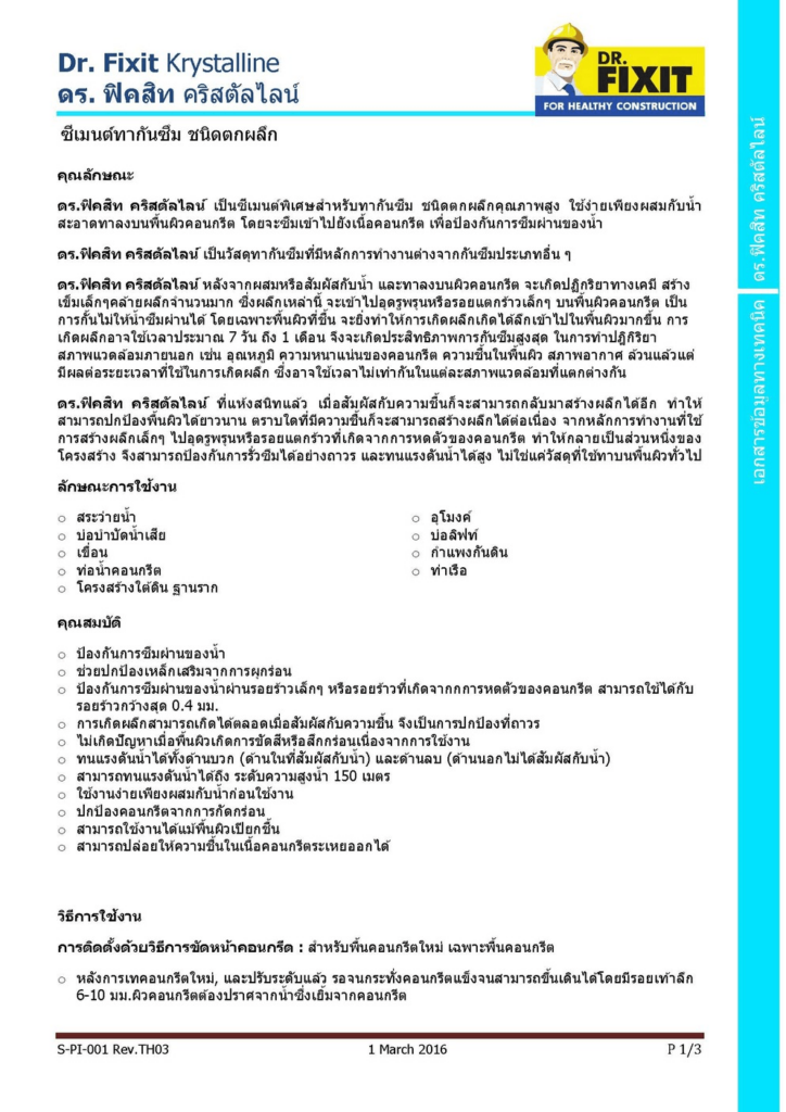 ดร.ฟิคสิท คริสตัลไลน์ เป็นซีเมนต์พิเศษสำหรับทากันซึม ชนิดตกผลึกคุณภาพสูง ใช้ง่ายเพียงผสมกับน้ำสะอาดทาลงบนพื้นผิวคอนกรีต โดยจะซึมเข้าไปยังเนื้อคอนกรีต เพื่อป้องกันการซึมผ่านของน้ำ
