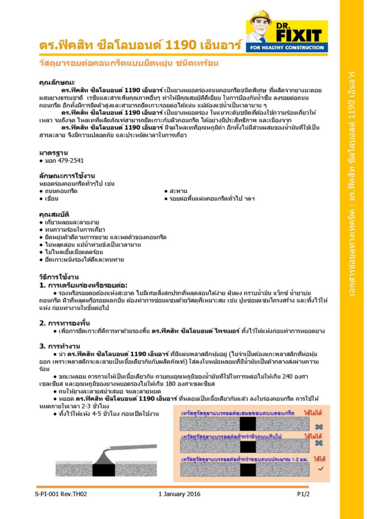 - ดร.ฟิคสิท ซีลโลบอนด์ 1190 เอ็นอาร์ เป็นยางหยอดร่อง ในแนวระดับชนิดที่ต้องใช้ความร้อนเคี่ยวให้เหลว จนถึงจุดไหลเทที่ผลิตภัณฑ์สามารถยึดเกาะกับผิวคอนกรีต ได้อย่างมีประสิทธิภาพ และเนื่องจาก ดร.ฟิคสิท ซีลโลบอนด์ 1190 เอ็นอาร์ มีจุดไหลเทที่อุณหภูมิต่ำ อีกทั้งไม่มีส่วนผสมของน้ำมันที่ใช้เป็นสารละลาย จึงมีความปลอดภัย และประหยัดเวลาในการเคี่่ยว