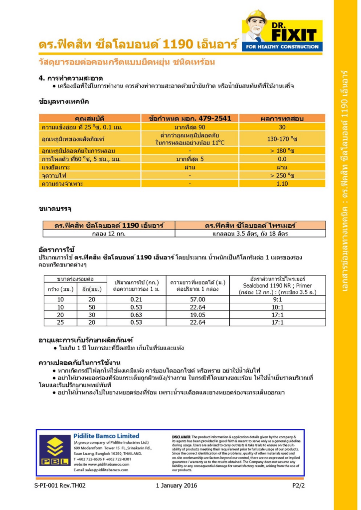 - ดร.ฟิคสิท ซีลโลบอนด์ 1190 เอ็นอาร์ เป็นยางหยอดร่องถนนคอนกรีตชนิดพิเศษ ที่ผลิตจากยางมะตอยผสมยางธรรมชาติ เรซินและสารเพิ่มคุณภาพอื่นๆ ทำให้มีคุณสมบัติดีเยี่ยม ในการป้องกันน้ำซึม ลงรอยต่อถนนคอนกรีต อีกทั้งมีการยืดตัวสูงและสามารถยึดเกาะรอยต่อได้แน่น แม้ต้องแช่น้ำเป็นเวลานานๆ