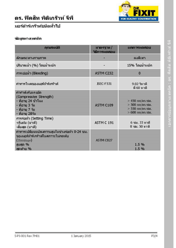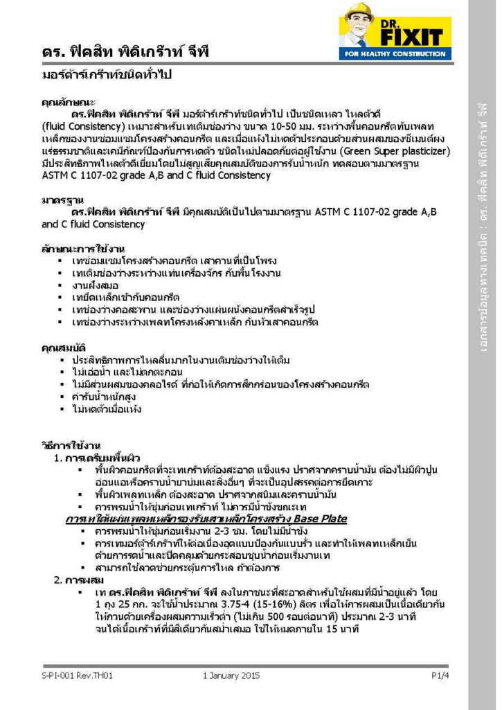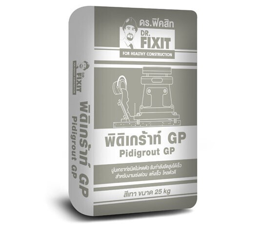ดร.ฟิคสิท พิดิเกร้าท์ จีพี มอร์ต้าร์เกร๊าท์ชนิดทั่วไป เป็นชนิดเหลว ไหลตัวดี เหมาะสำหรับเทเติมช่องว่าง ขนาด 10-50 มม. ระหว่างพื้นคอนกรีตทับเพลท เหล็กของงานซ่อมแซมโครงสร้างคอนกรีต และเมื่่อแห้งไม่หดตัวประกอบด้วยส่วนผสมของซีเมนต์ผง แร่ธรรมชาติและเคมีภัณฑ์ป้องกันการหดตัว ชนิดใหม่ปลอดภัยต่อผู้ใช้งาน ประสิทธิภาพไหลตัวดีเยี่ยมโดยไม่สูญเสียคุณสมบัติของการรับน้ำหนัก ทดสอบตามมาตรฐาน ASTM C 1107-02 grade A, B and C fluid Consistency