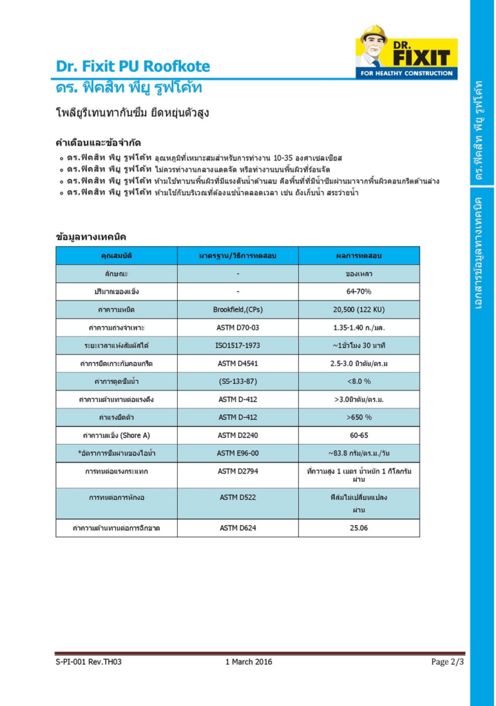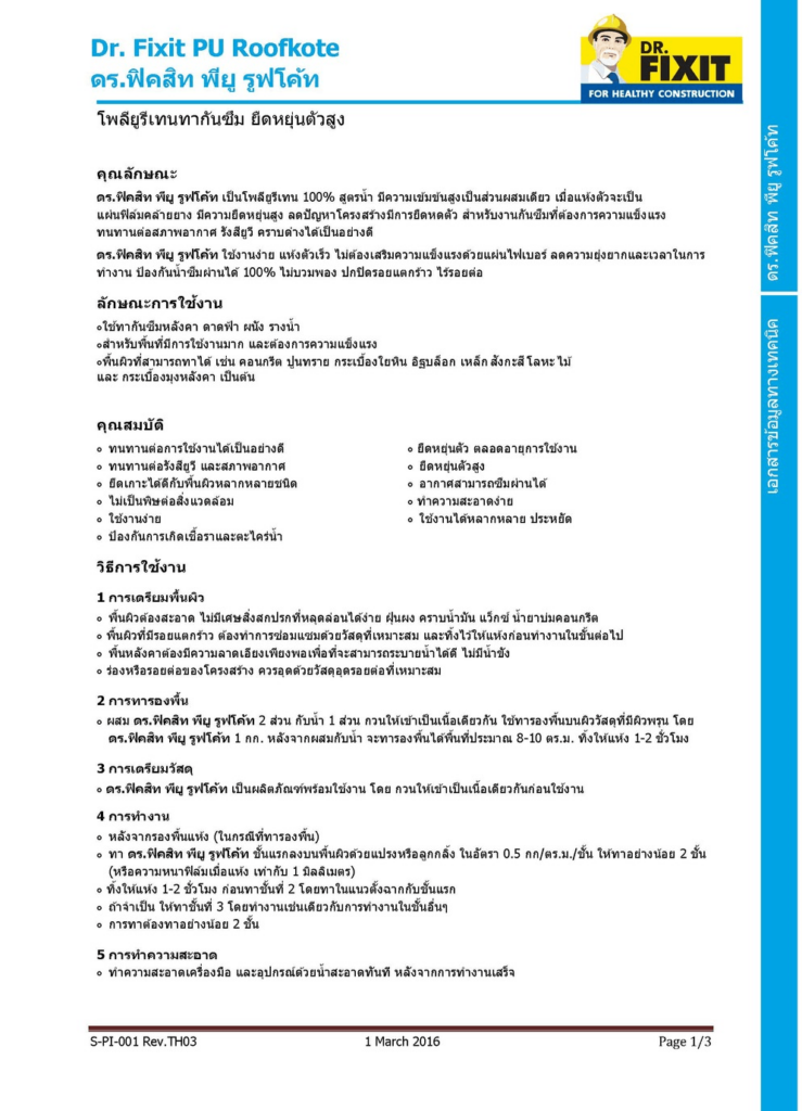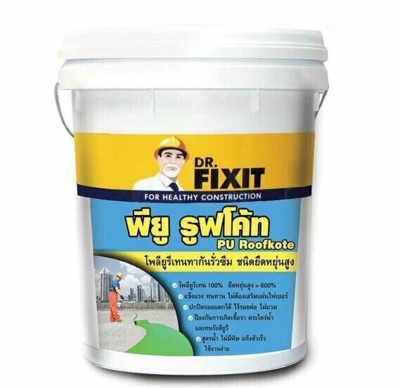 ดร.ฟิคสิท พียู รูฟโค้ท เป็นโพลียูรีเทน 100% สูตรน้ำ มีความเข้มข้นสูงเป็นส่วนผสมเดียว เมื่อแห้งตัวจะเป็นแผ่นฟิล์มคล้ายยาง มีความยืดหยุ่นสูง ลดปัญหาโครงสร้างมีการยืดหดตัว ส้าหรับงานกันซึมที่ต้องการความแข็งแรง ทนทานต่อสภาพอากาศ รังสียูวี คราบด่างได้เป็นอย่างดี