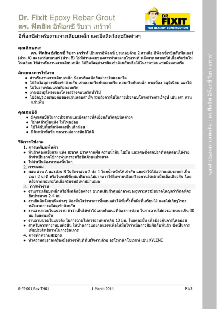 ดร. ฟิคสิท อีพ็อกซี่ รีบรา เกร้าท์ เป็นกาวอีพ็อกซี่ ประกอบด้วย 2 ส่วนคือ อีพ็อกซี่เรซินกับฟิลเลอร์ (ส่วน A) และฮาร์เดนเนอร์ (ส่วน B) ไม่มีส่วนผสมของสารทำละลายโซเวนท์ หลังจากผสมจะได้เนื้อครีมข้นไม่ไหลย้อย ใช้สำหรับงานเจาะเสียบเหล็ก ใช้ยึดวัสดุต่างชนิดเข้าด้วยกันหรือใช้ในงานซ่อมแซมผิวคอนกรีต