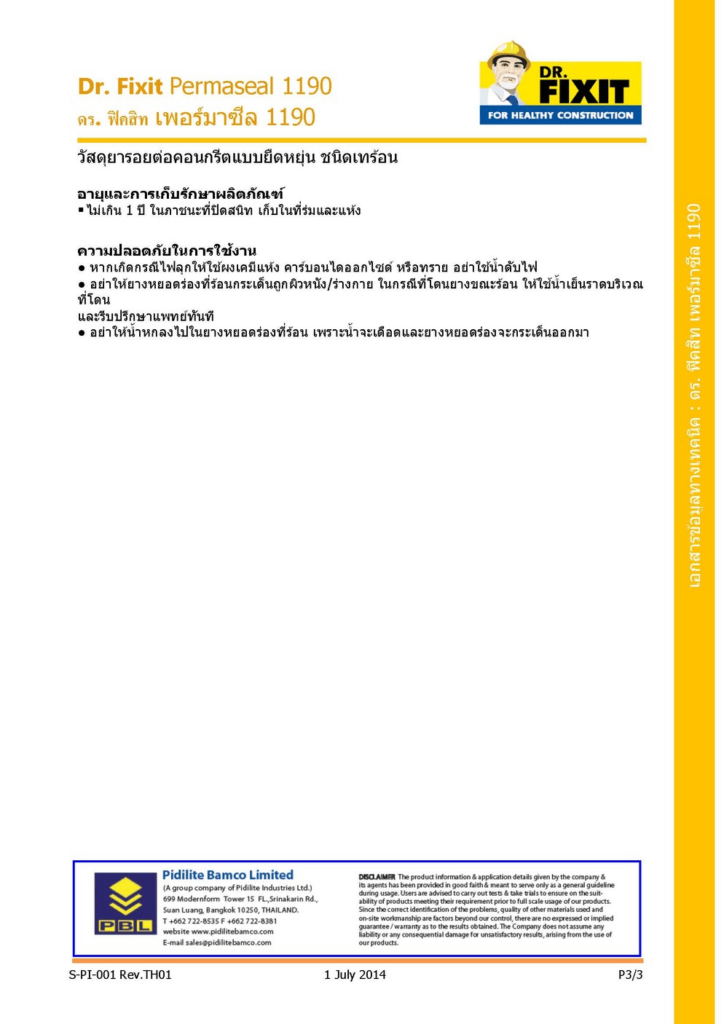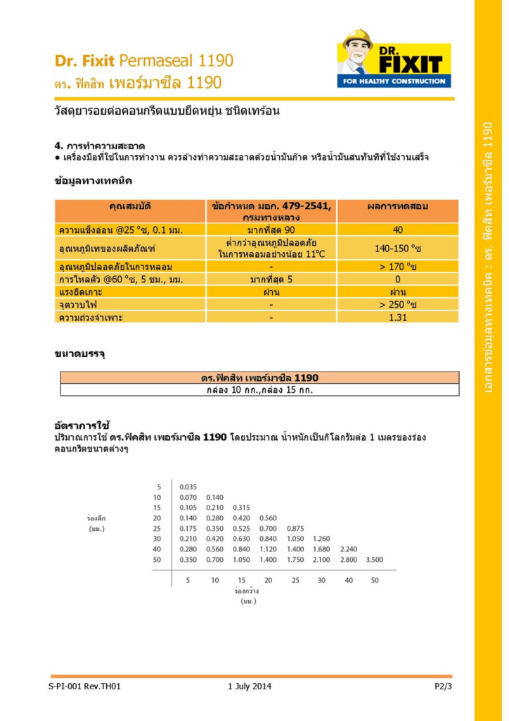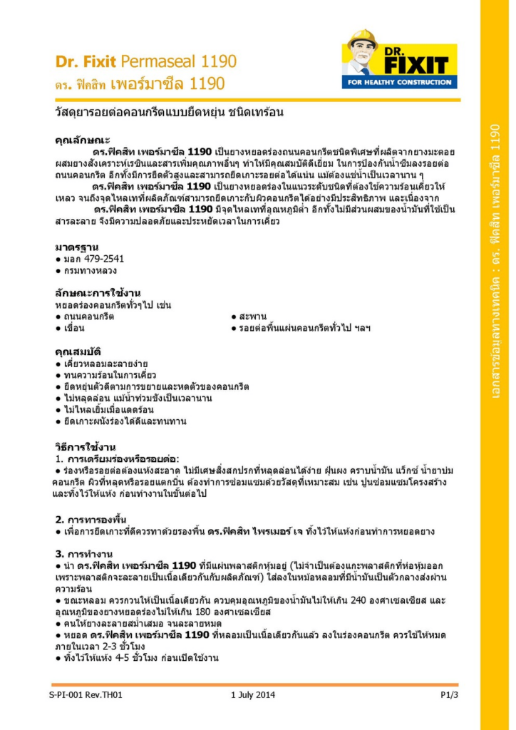 ดร.ฟิคสิท เพอร์มาซีล 1190 เป็นยางหยอดร่องในแนวระดับชนิดที่ต้องใช้ความร้อนเคี่ยวให้เหลว จนถึงจุดไหลเทที่ผลิตภัณฑ์สามารถยึดเกาะกับผิวคอนกรีตได้อย่างมีประสิทธิภาพ