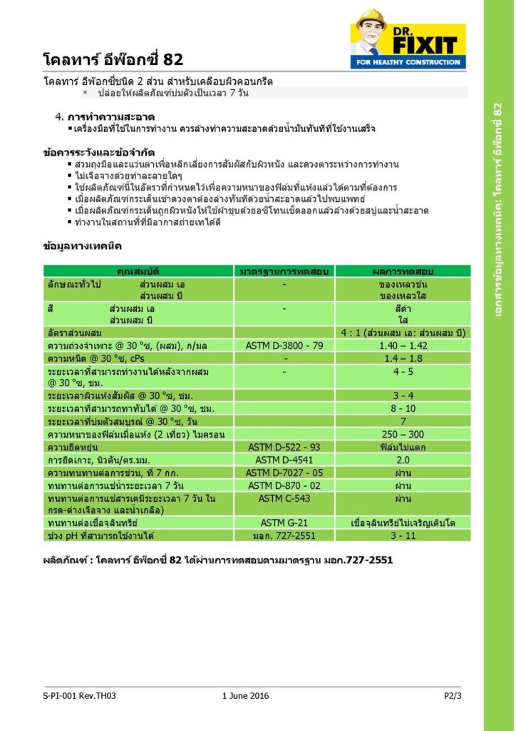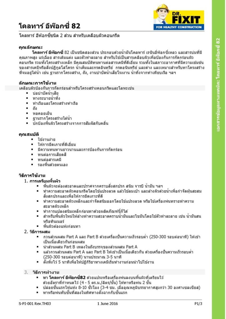 ดร. ฟิคสิท โคลทาร์ อีพ็อกซี 82 เป็นชนิดสองส่วน ประกอบด้วยน้ำมันโคลทาร์ เรซินอีพอกซี่เหลว และสารบ่มที่มีคุณภาพสูง แร่เฉื่อย สารเติมแต่ง และตัวทำละลาย สำหรับใช้เป็นสารเคลือบผิวเพื่อป้องกันการกัดกร่อนผิวคอนกรีตรวมทั้งโครงสร้างเหล็ก มีคุณสมบัติทนทานต่อสารเคมีที่ดีเยี่ยม รวมทั้งในสภาวะอากาศที่มีความเข้มข้นของสารเคมีหรือสิ่งปฏิกูลโสโครก น้ำเค็มและกรดอินทรีย์ กรดอนินทรีย์ และด่าง และเหมาะสำหรับทาโครงสร้างที่จมอยู่ใต้น้ำ เช่น ฐานรากโครงสร้าง ถัง งานบำบัดน้ำเสียโรงงาน น้ำทิ้งจากท่าเทียบเรือ ฯลฯ