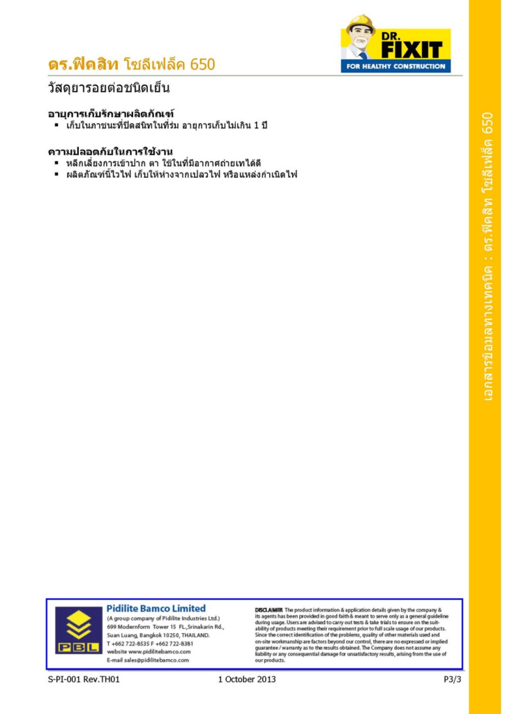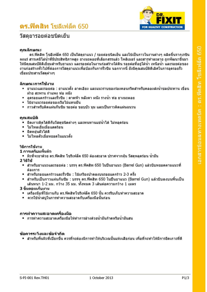 ดร.ฟิคสิท โซลีเฟล็ค 650 เป็นวัสดุยาแนวรอยต่อชนิดเย็น และใช้เป็นกาวในงานต่างๆ ผลิตขึ้นจากเรซิ่น ผงแร่ สารเคมีไล่น้ำที่มีประสิทธิภาพสูง ยางมะตอยที่เลือกสรรแล้ว โพลิเมอร์ และสารทำละลาย ถูกพัฒนาขึ้นมาให้มีคุณสมบัติดีเยี่ยมสำหรับยาแนว และรอยต่อในงานก่อสร้างใต้ดิน รอยต่อที่อยู่ใต้น้ำ เหนือน้ำ และรอยต่อของงานก่อสร้างทั่วไปที่ต้องการวัสดุยาแนวเพื่อป้องกันการรั่วซึม นอกจากนี้ ยังมีคุณสมบัติดีเลิศในการอุดรอยรั่วเชื่อมประสานวัสดุต่างๆ