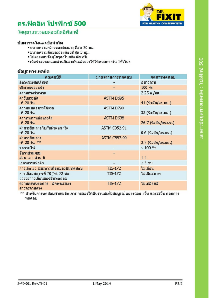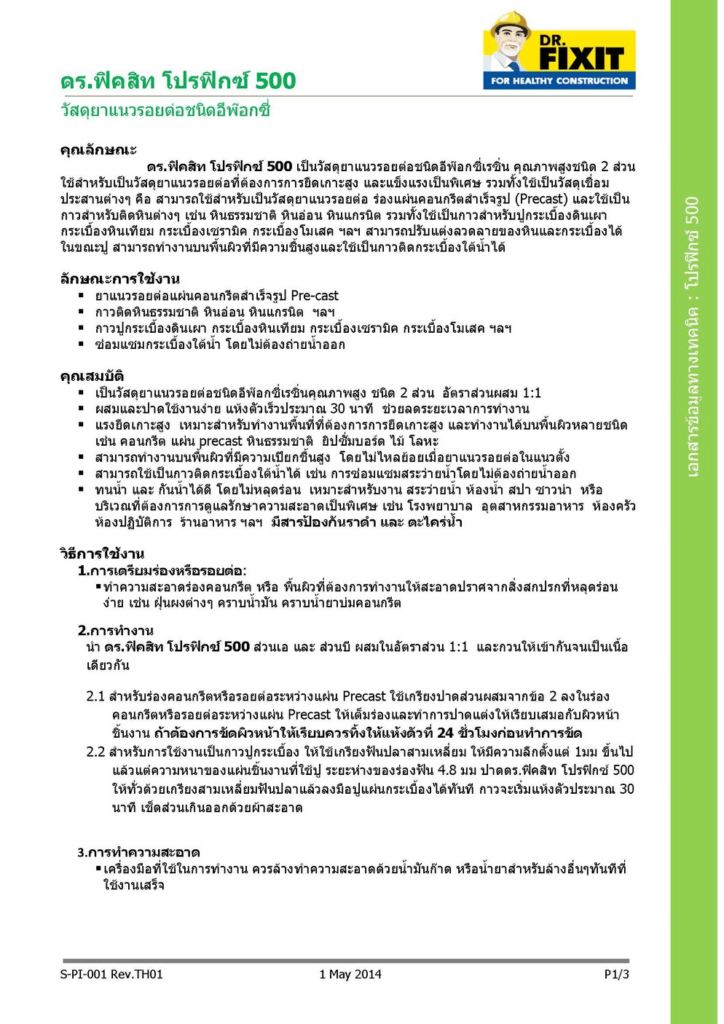 ดร.ฟิคสิท โปรฟิกซ์ 500 เป็นวัสดุยาแนวรอยต่อชนิดอีพ๊อกซี่เรซิ่น คุณภาพสูงชนิด 2 ส่วน ใช้สำหรับเป็นวัสดุยาแนวรอยต่อทีต้องการการยึดเกาะสูง และแข็งแรงเป็นพิเศษ รวมทั้งใช้เป็นวัสดุเชื่อมประสานต่างๆ คือ สามารถใช้สำหรับเป็นวัสดุยาแนวรอยต่อ ร่องแผ่นคอนกรีตสำเร็จรูป และใช้เป็นกาวสำหรับติดหินต่างๆ เช่น หินธรรมชาติ หินอ่อน หินแกรนิต รวมทั้งใช้เป็นกาวสำหรับปูกระเบื้องดินเผากระเบื้องหินเทียม กระเบื้องเซรามิค กระเบื้องโมเสค ฯลฯ สามารถปรับแต่งลวดลายของหินและกระเบื้องได้ในขณะปู สามารถทำงานบนพื้นผิวที่มีความชื้นสูงและใช้เป็นกาวติดกระเบื้องใต้น้ำได้