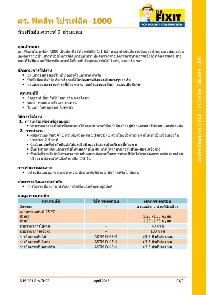 ดร. ฟิคสิทโปรเฟล็ค 1000 เป็นชันฝรั่งอีพ็อกซี่ไม่หดตัว ชนิด 2:1 มีลักษณะครีมข้นสีขาว ชนิดสองส่วนประกอบ ส่วนเอผลิตจากเรซิ่น สารที่ช่วยให้การยึดเกาะ และส่วนบีผลิตจากสารเร่งการกระบวนการแข็งตัวที่คัดสรรแล้ว สารผสมที่ได้มีคุณสมบัติการยึดเกาะที่ดีเยี่ยมกับวัสดุแห้ง เช่น ไม้ โลหะ คอนกรีต ฯลฯ