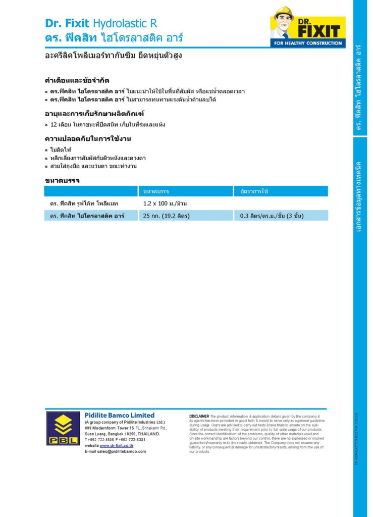ดร.ฟิคสิท ไฮโดรลาสติค อาร์ เป็นอะครีลิคทากันซึม ความเข้มข้นโพลีเมอร์สูง ส่วนผสมเดียว เมื่่อแห้งตัวจะเป็นแผ่นฟิล์มความยืดหยุ่นสูง สำหรับงานกันซึม