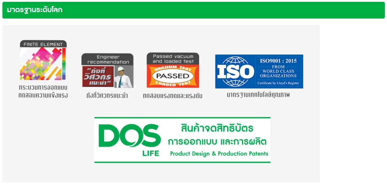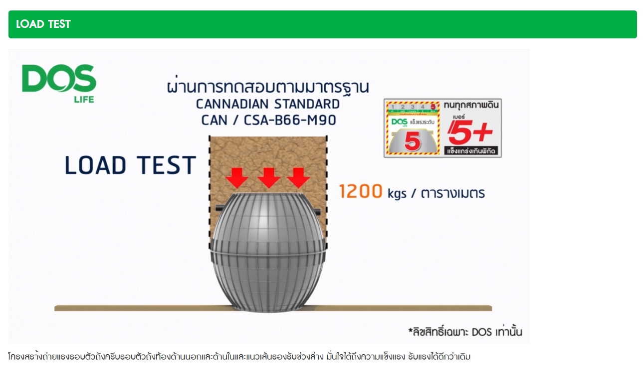 - ผ่านเกณฑ์การทดสอบความแข็งแรงอ้างอิงตามเกณฑ์มาตรฐาน มอก. 2962-2562 (VACUUM TEST, LOAD TEST, TENSILE TEST, การทดสอบความแข็งแรงของผนังแบ่งส่วนในถังบำบัด