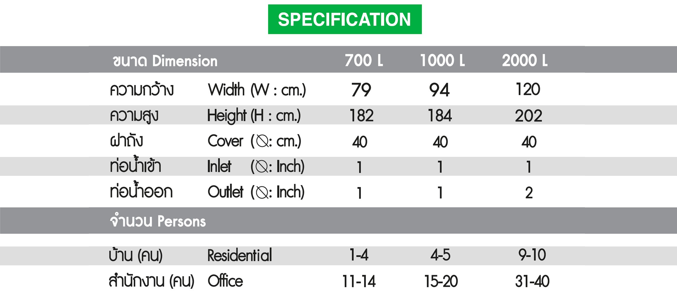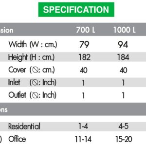 ขนาด(ลิตร) : 700 , 700(H) , 1,000 และ 2,000