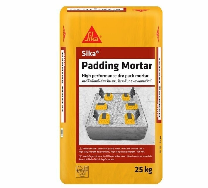 Sika Padding Mortar ปูนปรับระดับฐานเครื่องจักร โดยทําการสกัดผิวคอนกรีตให้มีความลึกอย่างน้อย 2 ซม.และกว้างกว่าแผ่นฐานประมาณ 10 ซม. ทําการขจัดสิ่งสกปรกตกค้าง เช่น คราบน้ำมัน คราบจารบี และเศษซีเมนต์ ออกจากบริเวณนั้นๆ พรมน้ำที่ผิวคอนกรีตให้เปียกชื้นและอิ่มตัว แต่ระวังไม่ให้น้ำท่วมขัง แนะนําให้ทําการปรับระดับด้วย Sika Padding Mortar อย่างน้อยที่ความหนาประมาณ 5 ซม.