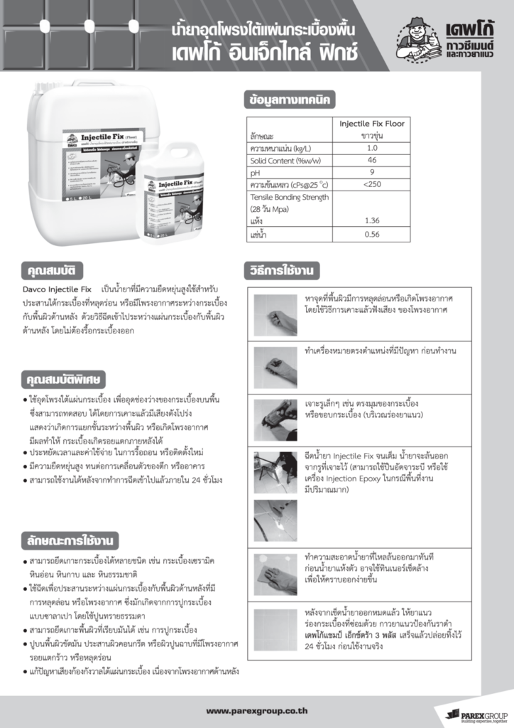 เดพโก้ อินเจ็กไทล์ ฟิกซ์ ( DAVCO INJECTILE FIX ) เป็นน้ำยาที่มีความยืดหยุ่นสูงใช้สำหรับประสานใต้กระเบื้องที่หลุดร่อน หรือมีโพรงอากาศระหว่างกระเบื้อง กับพื้นผิวด้านหลัง ด้วยวิธีฉีดเข้าไประหว่างแผ่นกระเบื้องกับพื้นผิวด้านหลัง โดยไม่ต้องรื้อกระเบื้องออก