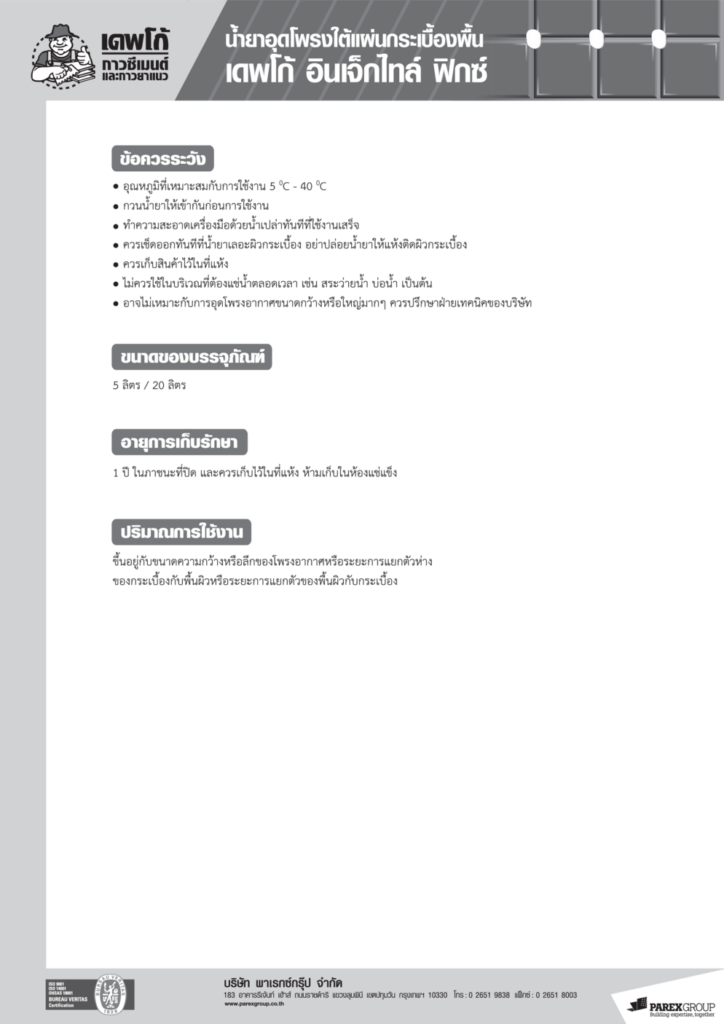 ปริมาณการใช้ : ขึ้นอยู่กับขนาดความกว้างหรือลึกของโพรงอากาศหรือระยะการแยกตัวห่างของกระเบื้องกับพื้นผิวหรือระยะการแยกตัวของพื้นผิวกับกระเบื้อง